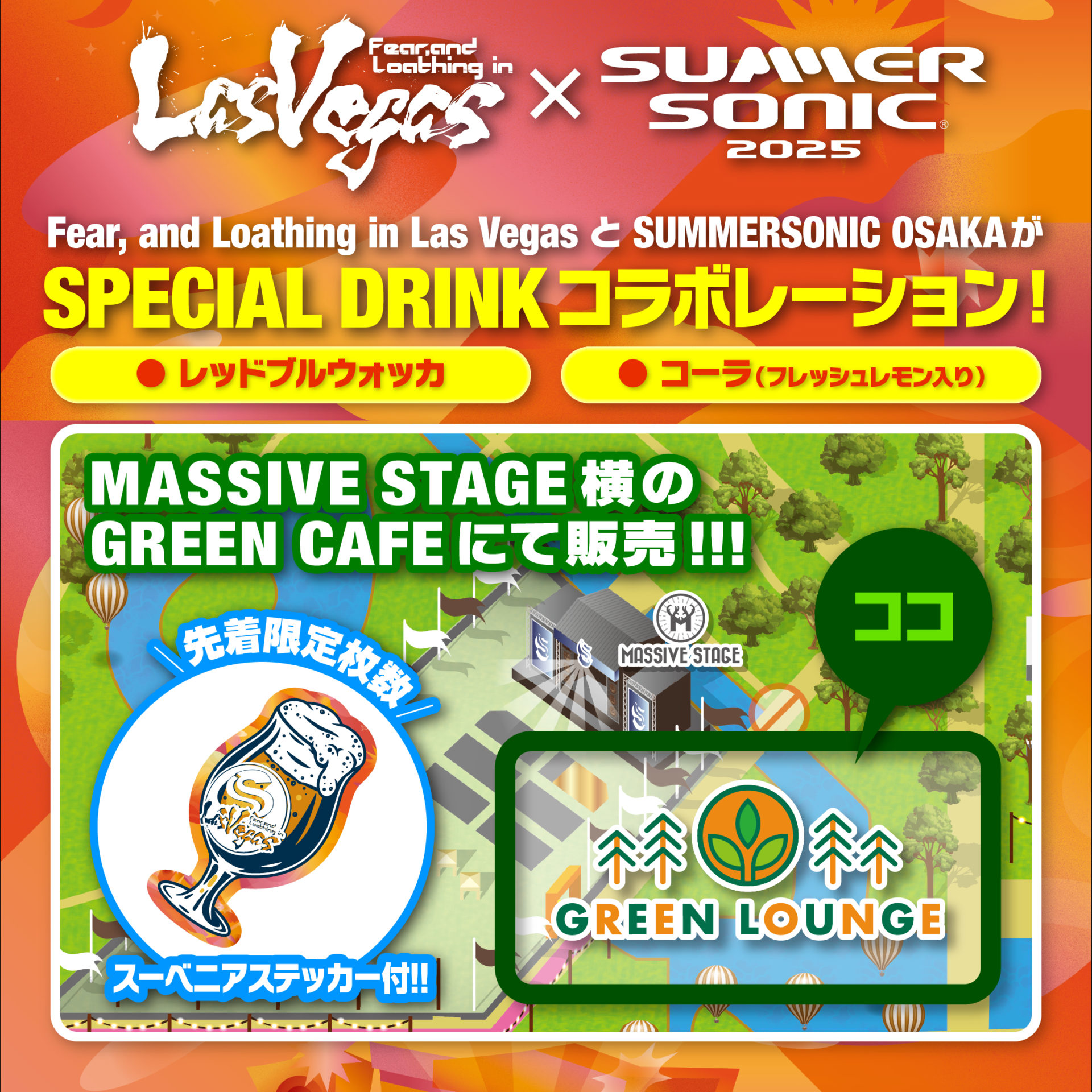 MASSIVE STAGE 横のGREEN LOUNGE限定で、スーベニアステッカー付きSPECIAL DRINKを販売します。